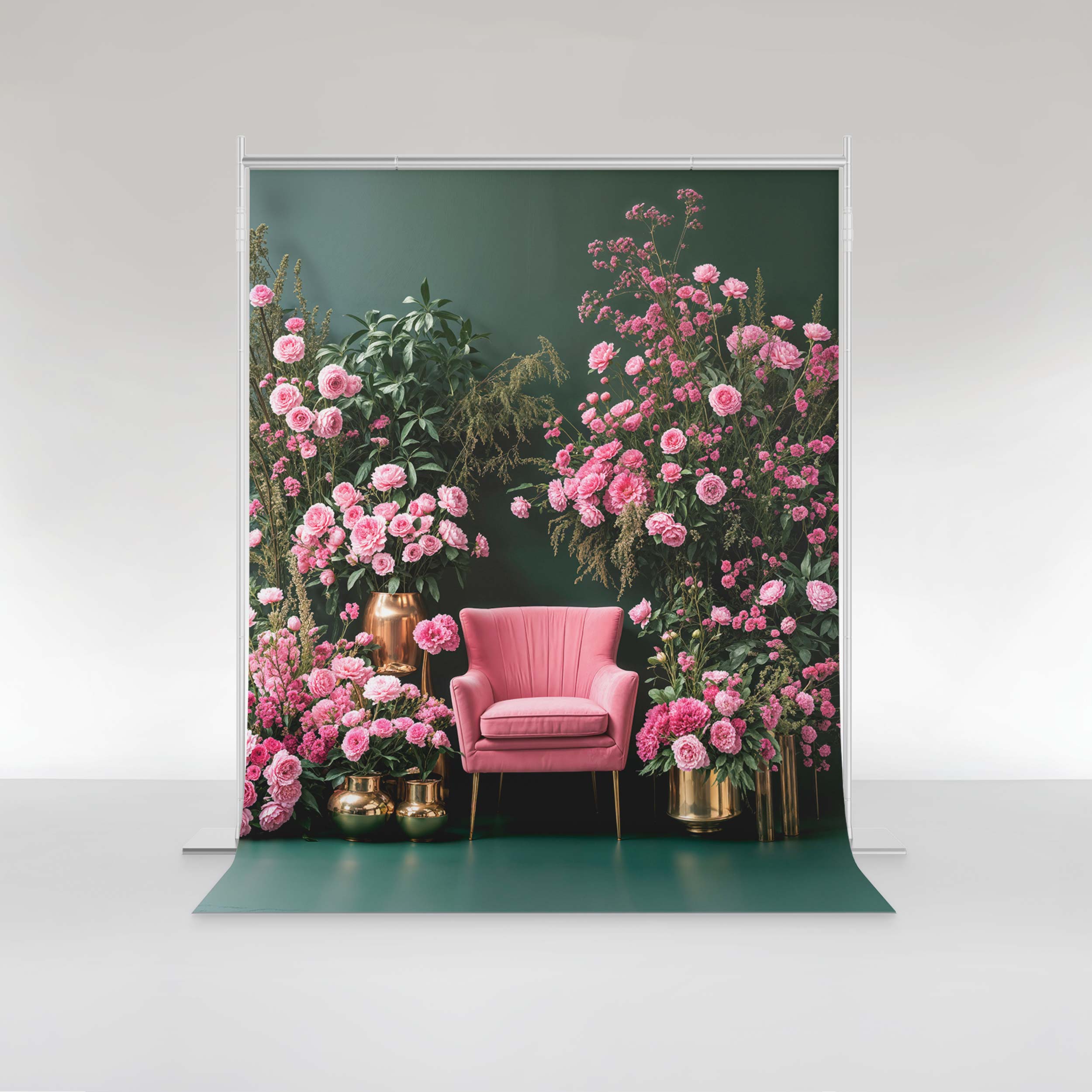 Fundo Fotográfico em Tecido Sublimado Floral Rosa com Poltrona