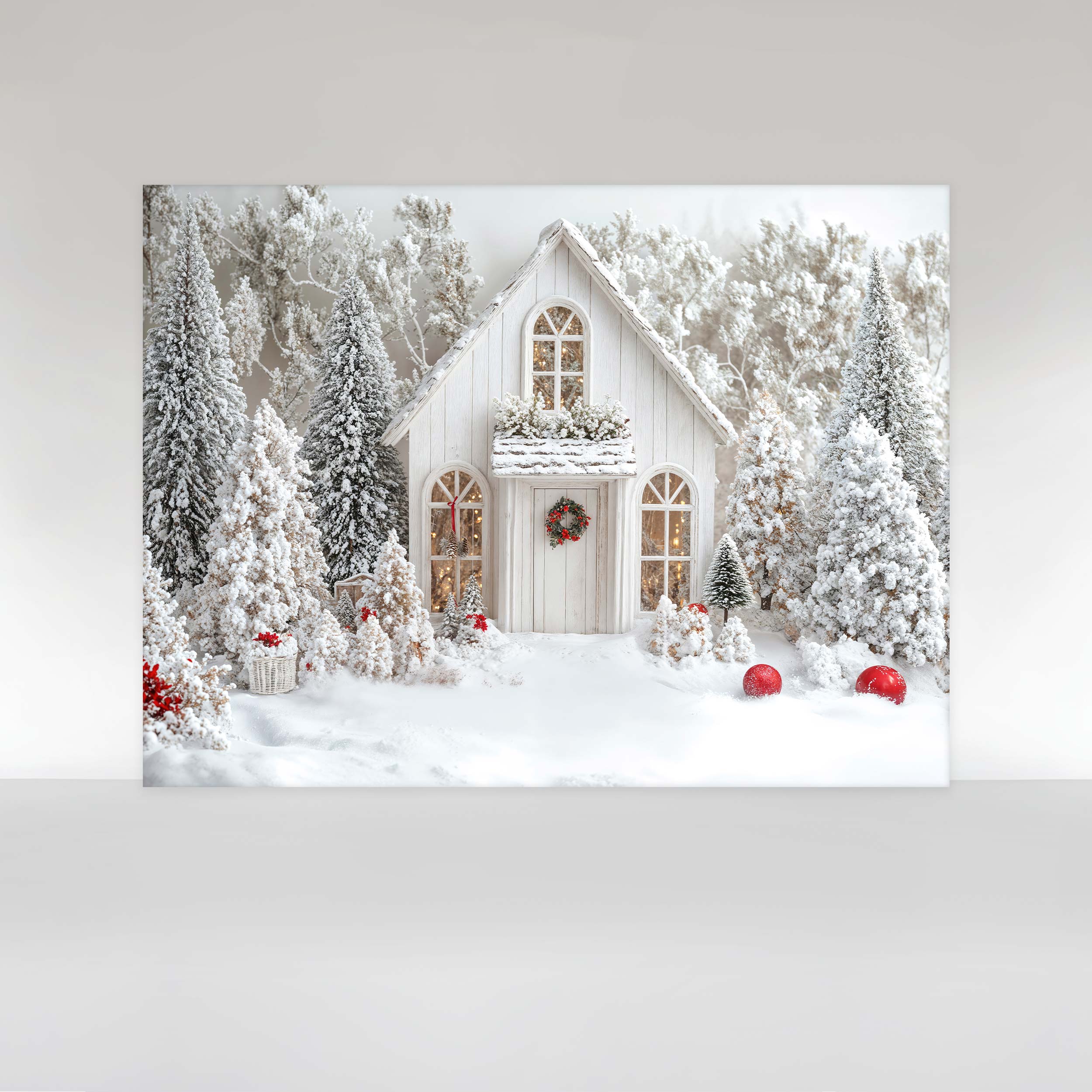 Painel de Festa em Tecido Sublimado Casinha Branca com Neve de Natal