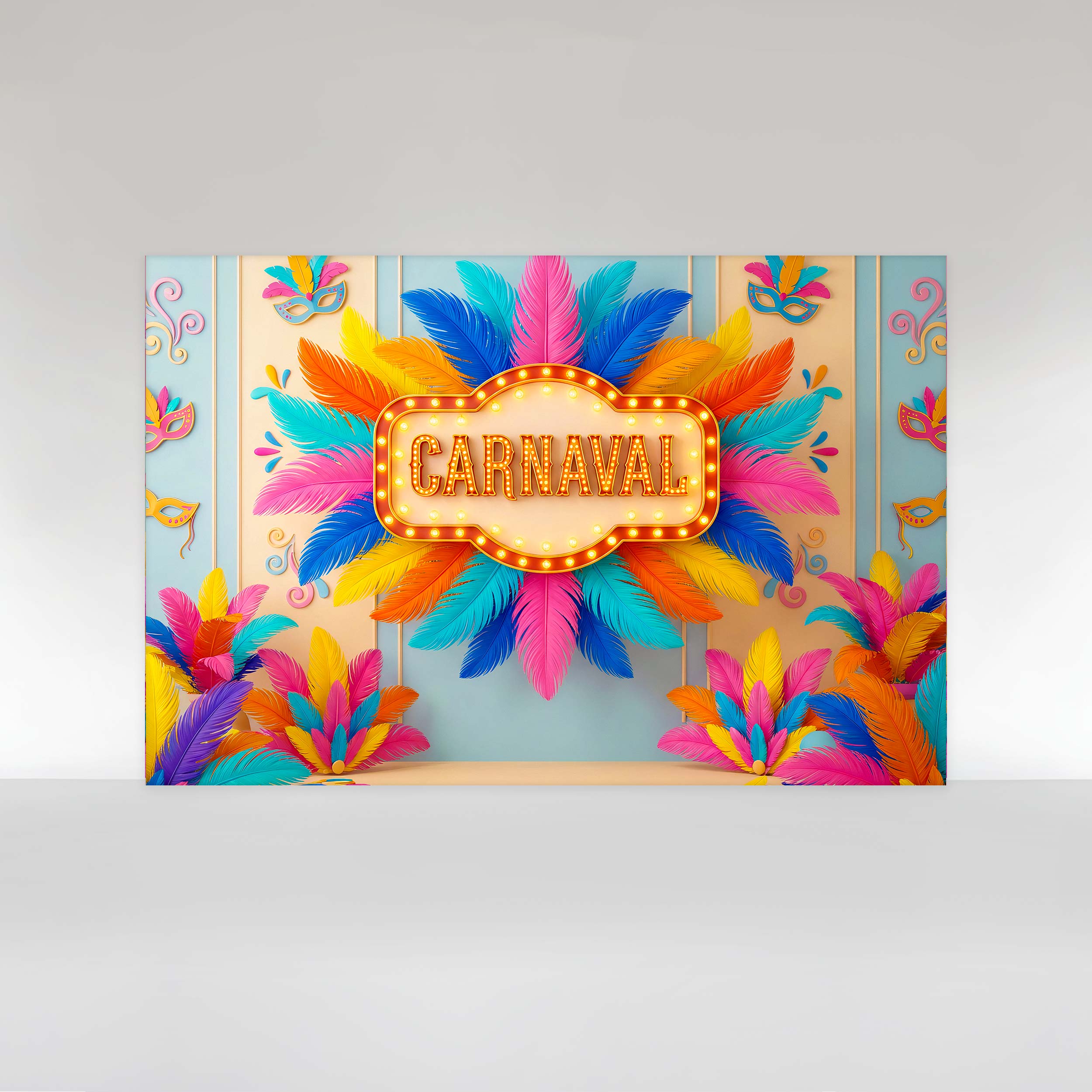 Painel de Festa em Tecido Sublimado Cenário de Carnaval com Plumas Coloridas e Máscaras