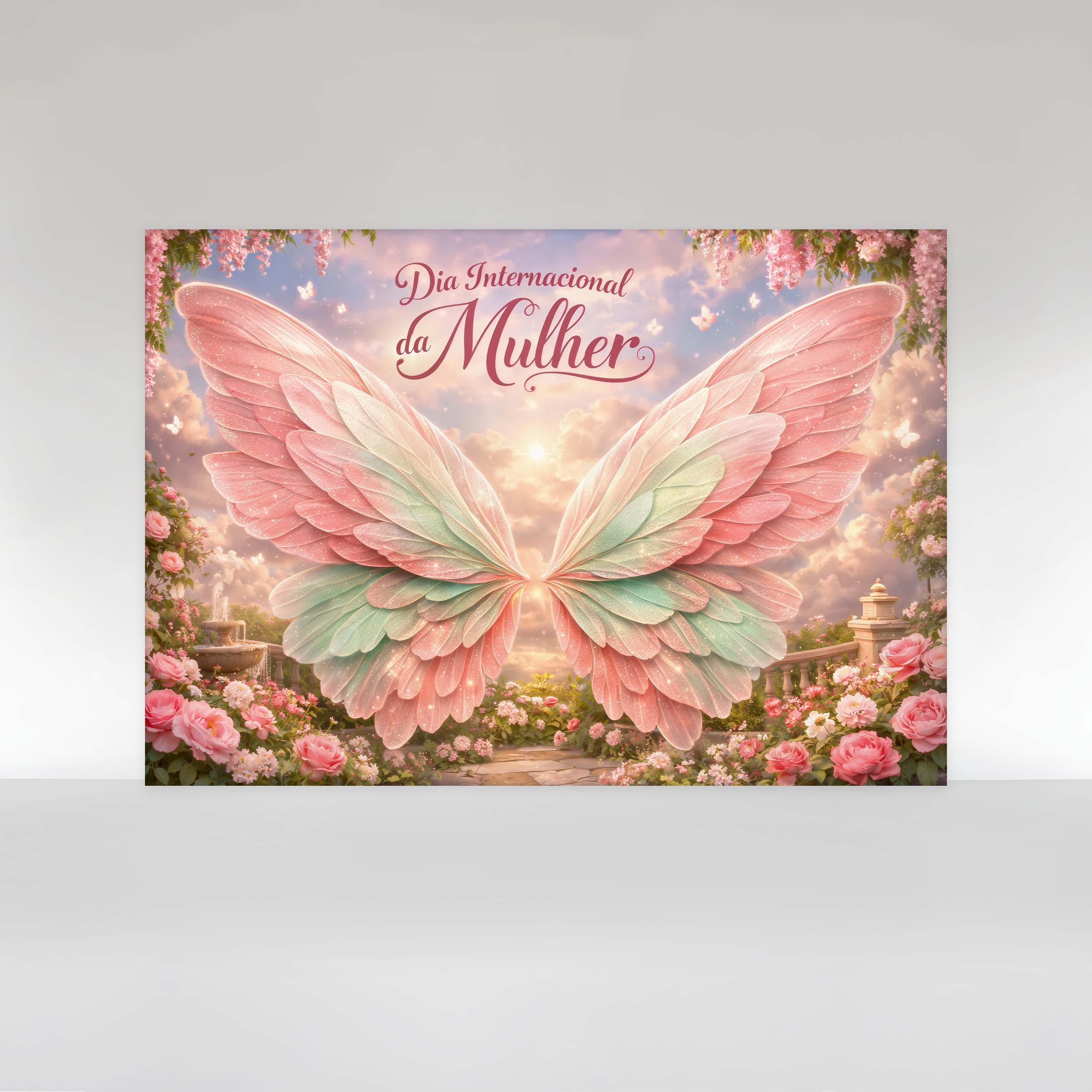 Painel de Festa em Tecido Sublimado Dia Internacional das Mulheres Asas de Borboleta Floral