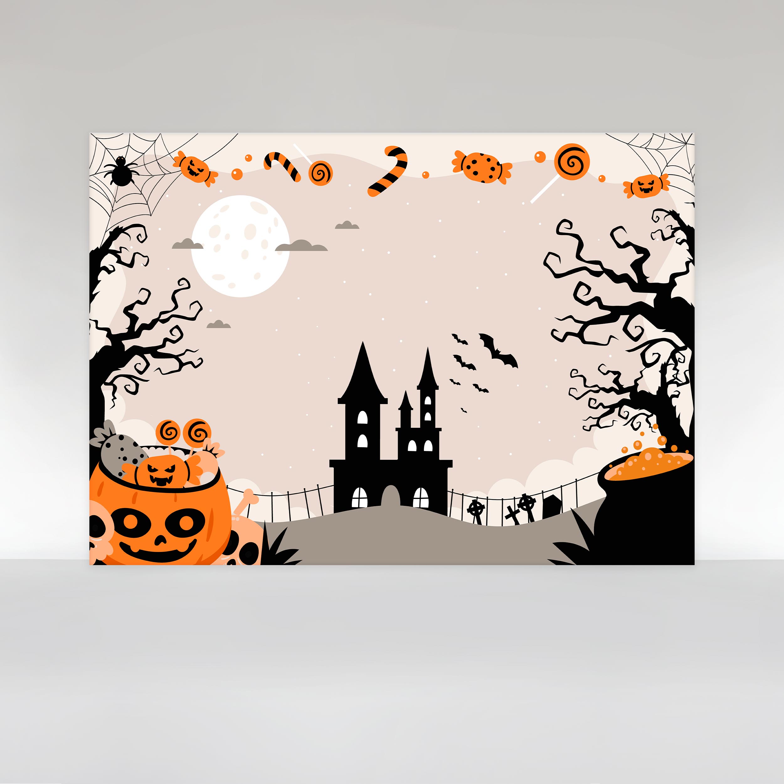 Painel de Festa em Tecido Sublimado Doces e Castelo Mal Assombrado de Halloween