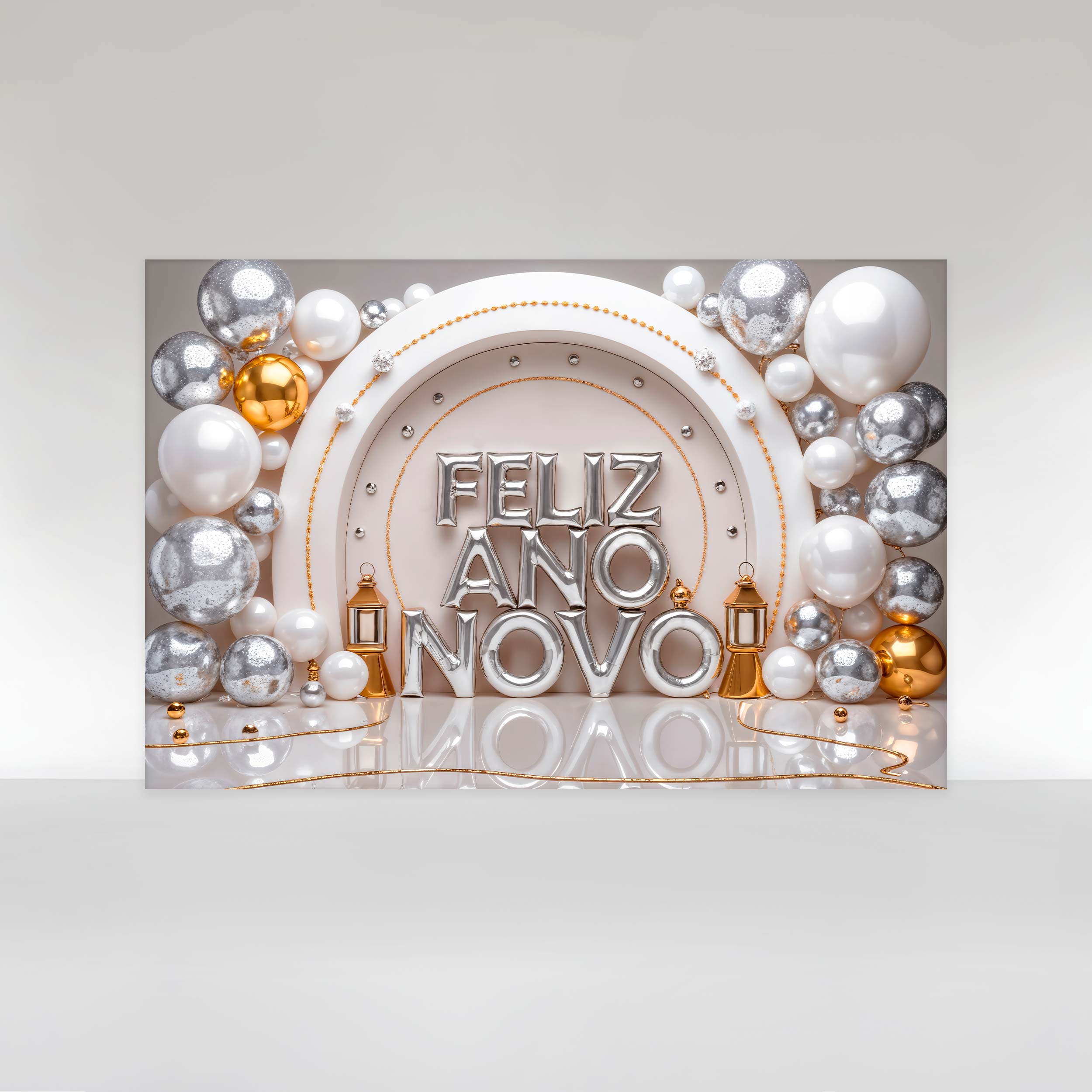 Painel de Festa em Tecido Sublimado Feliz Ano Novo Prata e Dourado