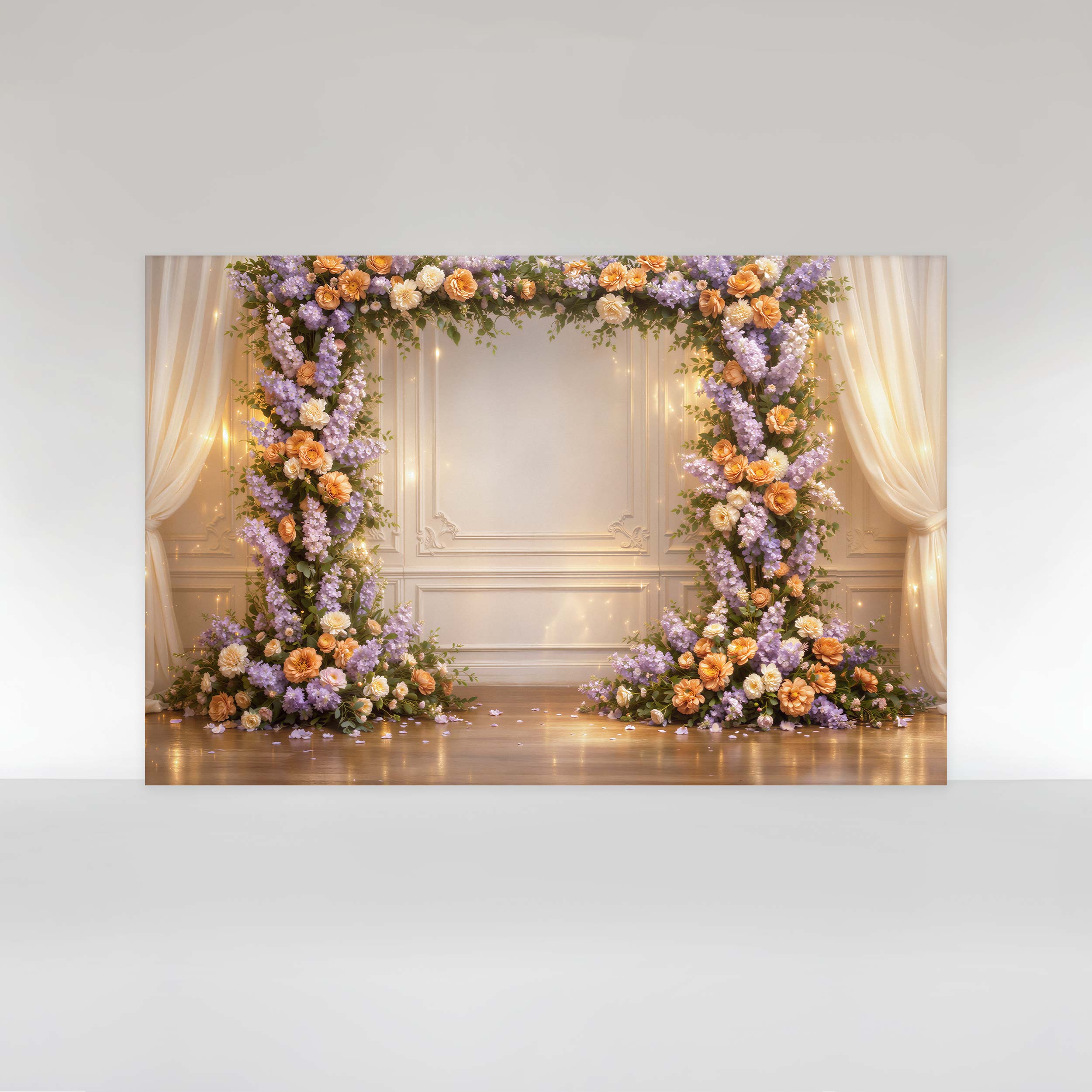 Painel de Festa em Tecido Sublimado Floral com C ortinas e Parede Boiserie