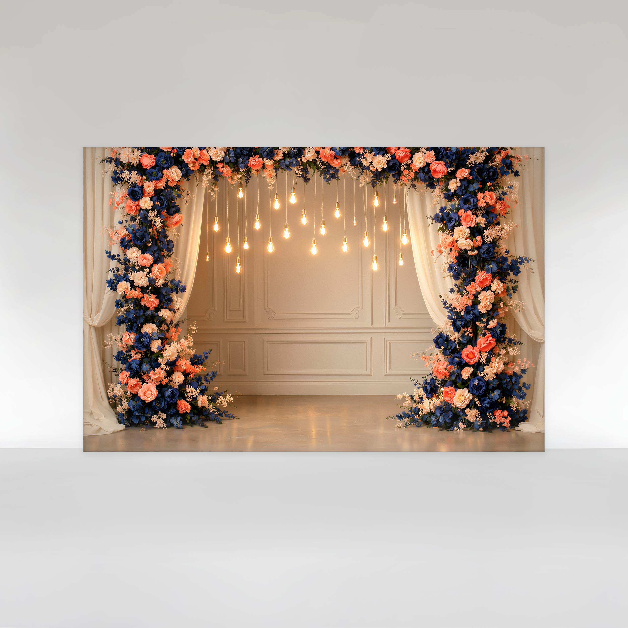 Painel de Festa em Tecido Sublimado Floral com Cortinas e Lâmpadas