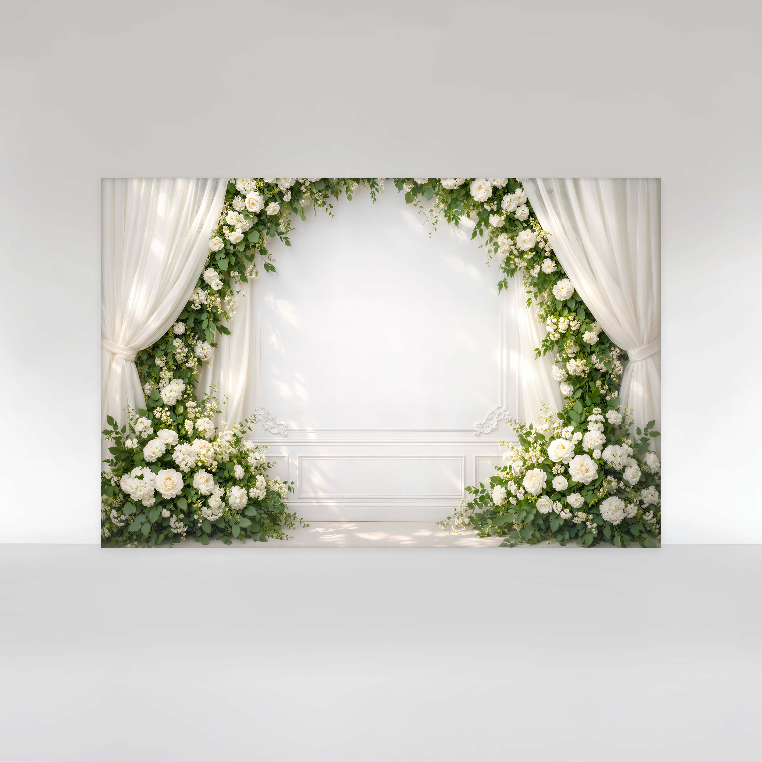 Painel de Festa em Tecido Sublimado Floral de Rosas Brancas com Cortinas