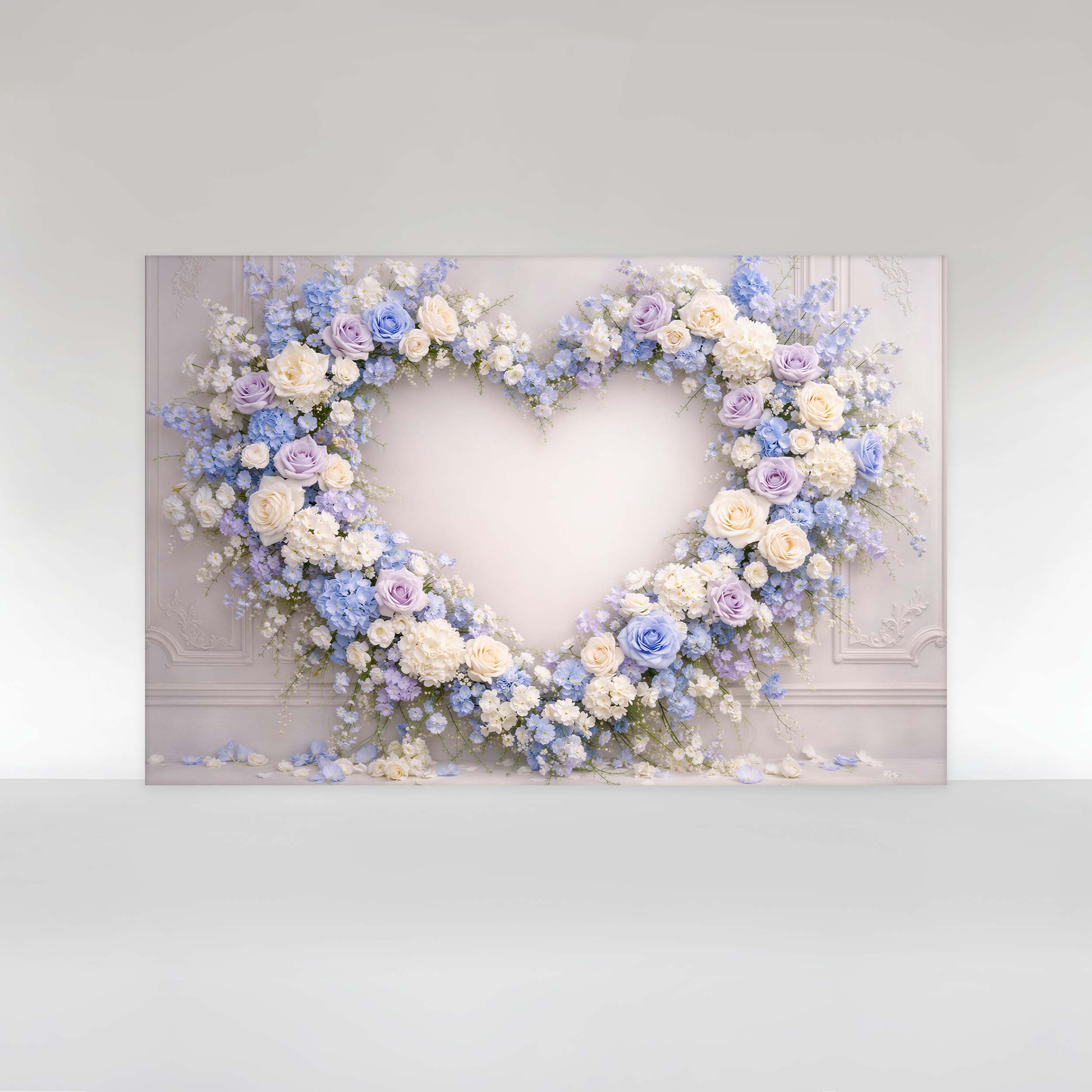 Painel de Festa em Tecido Sublimado Floral em Formato de Coração com Rosas Lilás e Azuis
