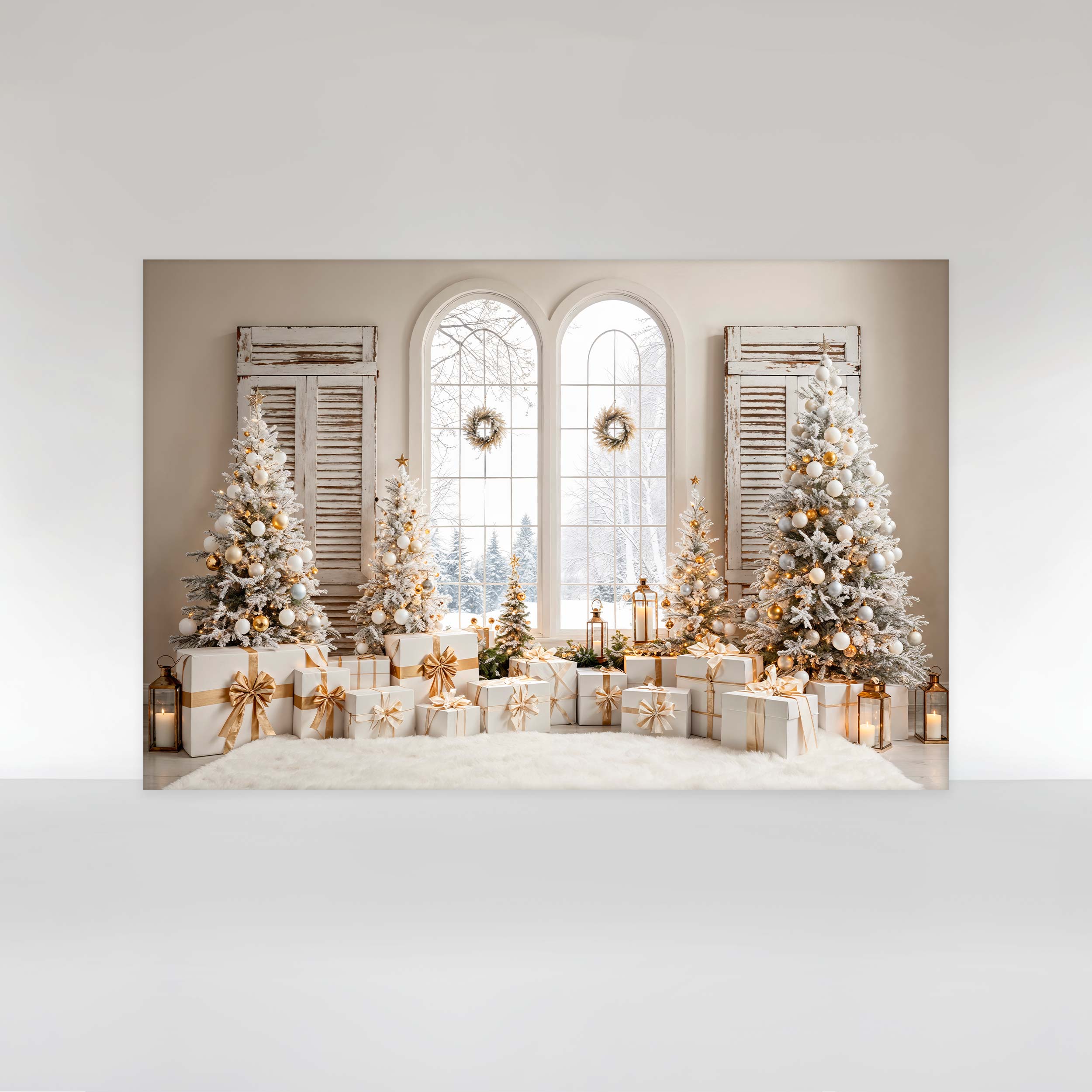 Painel de Festa em Tecido Sublimado Janelas Romanas com Presentes Dourados de Natal