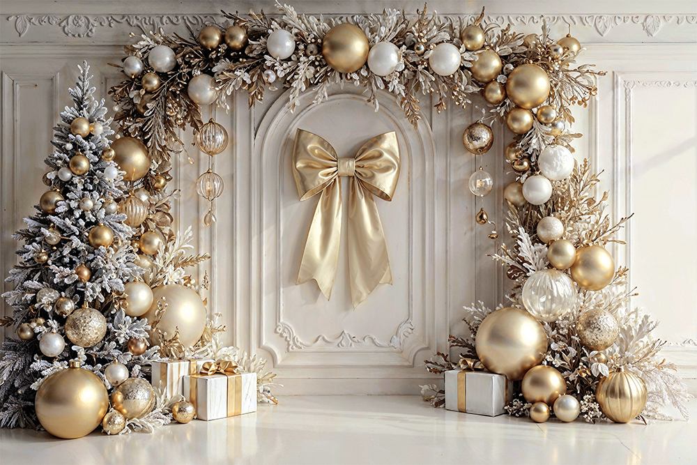 Painel de Festa em Tecido Sublimado Natal Dourado e Branco com Laço