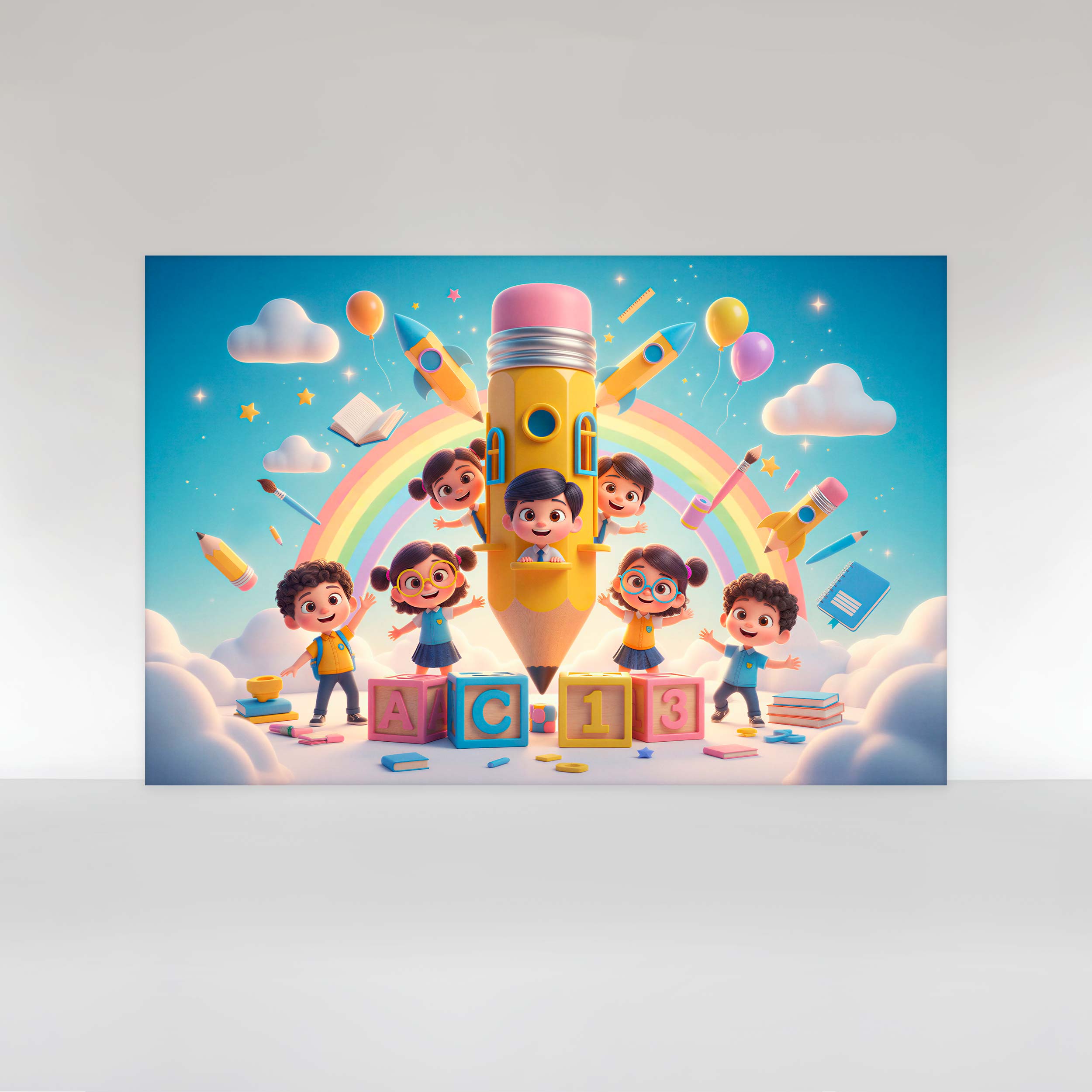 Painel de Festa em Tecido Sublimado Volta às aulas ABC Lápis Arco Íris
